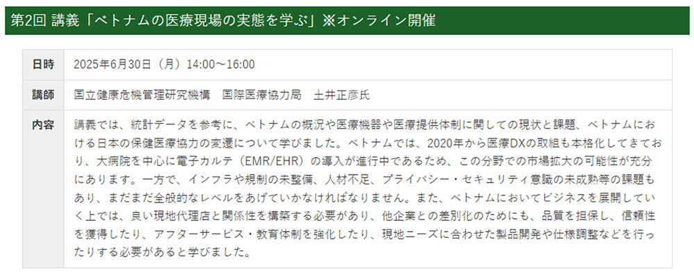 イベント 東京都医工連携HUB機構主催の第13期医療機器開発海外人材育成プログラム第2回講義を弊社CEOの小柴が受講しました。 2025.06.30 東京都医工連携HUB機構主催の 第13期医療機器開発海外人材育成プログラム 第2回講義を弊社CEOの小柴が受講しました。