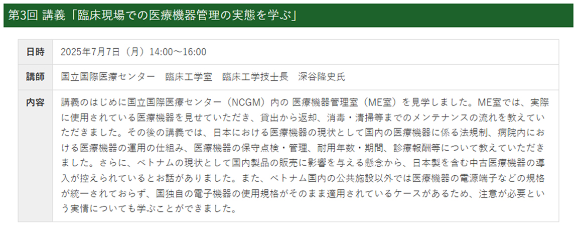 イベント 東京都医工連携HUB機構主催の第13期医療機器開発海外人材育成プログラム第3回講義を弊社CEOの小柴が受講しました。 2025.07.07 東京都医工連携HUB機構主催の 第13期医療機器開発海外人材育成プログラム 第3回講義を弊社CEOの小柴が受講しました。