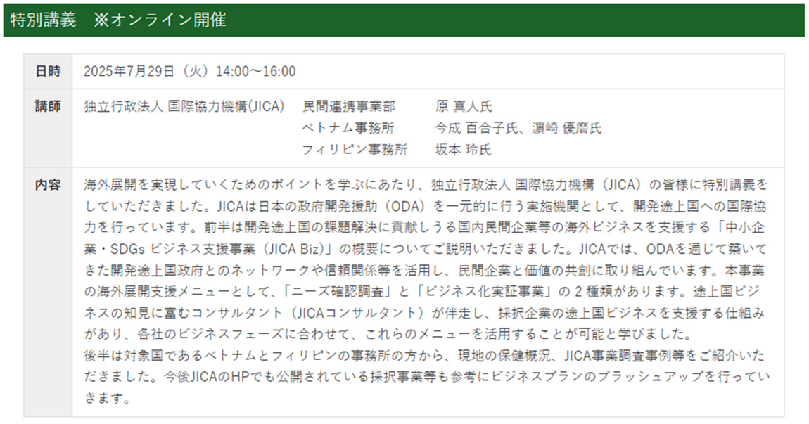 イベント 東京都医工連携HUB機構主催の第13期医療機器開発海外人材育成プログラム特別講義を弊社CEOの小柴が受講しました。 2025.07.29 東京都医工連携HUB機構主催の 第13期医療機器開発海外人材育成プログラム 特別講義を弊社CEOの小柴が受講しました。