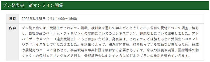 イベント 東京都医工連携HUB機構主催の第13期医療機器開発海外人材育成プログラムプレ発表会に弊社CEOの小柴が参加しました。 2025.08.25 東京都医工連携HUB機構主催の 第13期医療機器開発海外人材育成プログラム 第5回講義を弊社CEOの小柴が受講しました。